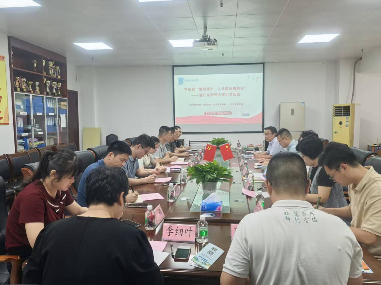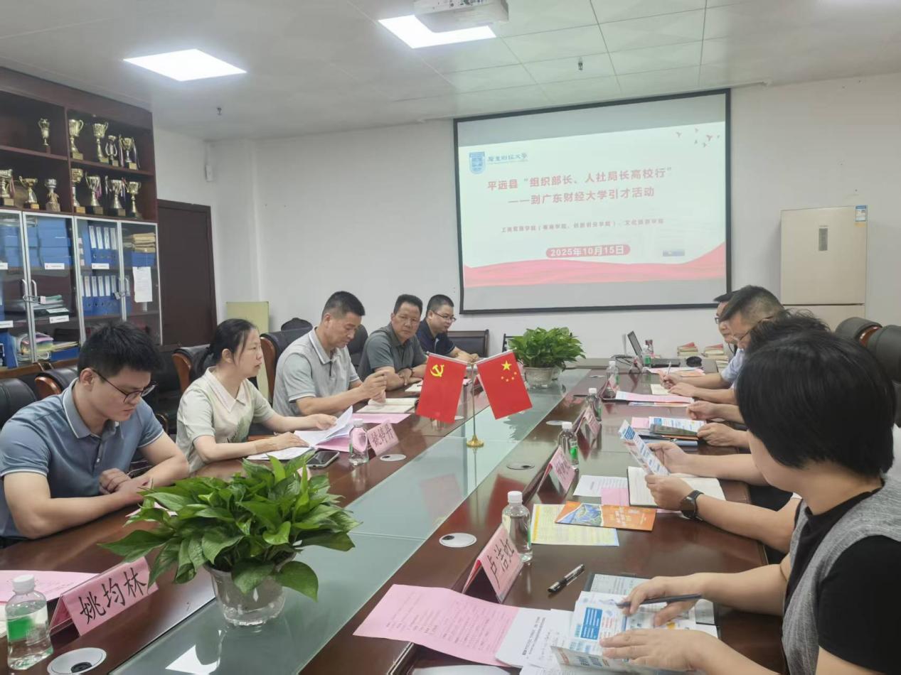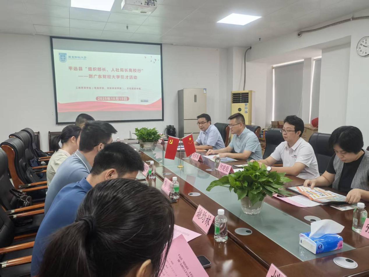 2025年10月15日下午,平远县“组织部长、人社局长高校行”引才活动在广东财经大学广州校区立德楼432顺利举行。本次活动由广东财经大学工商管理学院(粤商学院、创新创业学院)院长马宗国主持,平远县领导及校方相关学院代表共同参与,围绕人才引进、校地合作等议题展开深入交流。