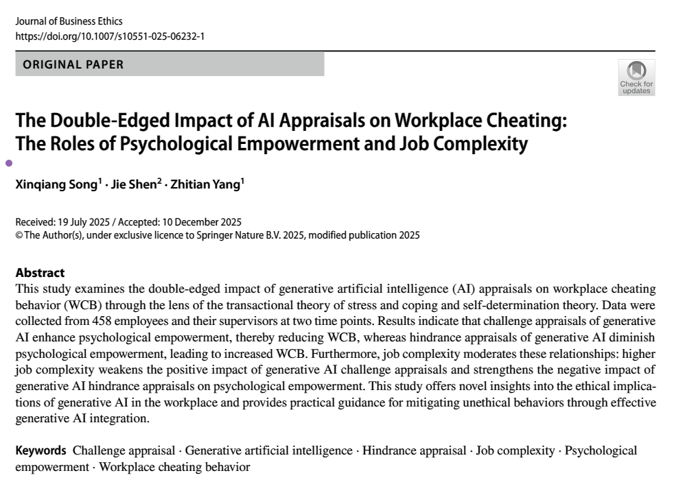该研究基于压力与应对交互理论和自我决定理论,探讨了生成式人工智能评估对职场作弊行为所产生的双重影响。研究发现:当员工将人工智能视为挑战性评估时,会增强其心理赋权感,从而减少职场作弊行为;而当员工将人工智能视为阻碍性评估时,则会削弱其心理赋权感,进而加剧职场作弊行为。工作复杂性在上述关系中起到调节作用:工作复杂性越高,人工智能挑战性评估对心理赋权的积极影响越弱,而阻碍性评估对心理赋权的消极影响则越强。本研究为如何通过有效整合人工智能进而减少员工不道德行为提供了重要启示。
