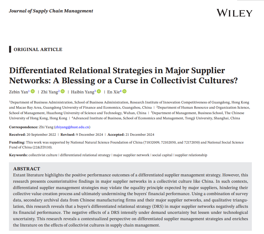 三、闫泽斌副教授论文:Differentiated relational strategies in major supplier networks: A blessing or a curse in collectivist cultures