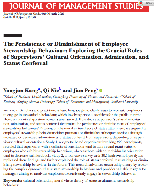 一、康勇军教授论文:The persistence or diminishment of employee stewardship behaviour: Exploring the crucial roles of supervisors’ cultural orientation, admiration, and status conferral