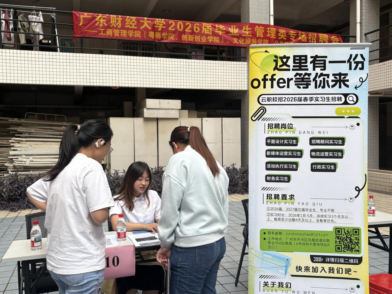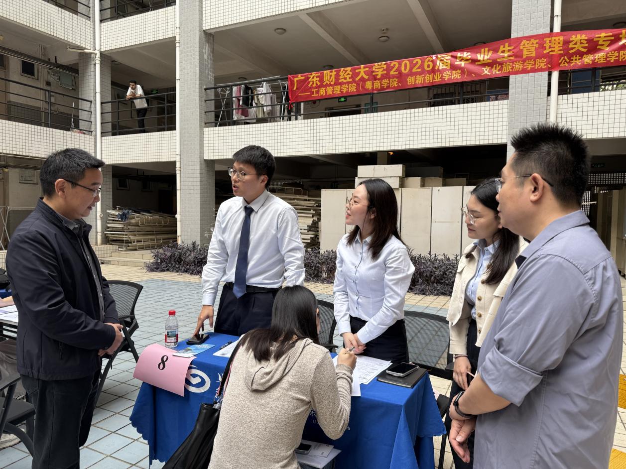 为深入贯彻落实高校毕业生就业工作部署,着力推动毕业生高质量充分就业,12月23日下午,广东财经大学2026届毕业生管理类专场招聘会在广州校区28栋学生社区一楼大厅成功举办。本次招聘会由工商管理学院(粤商学院、创新创业学院)联合公共管理学院、文化旅游学院、人力资源学院共同主办。