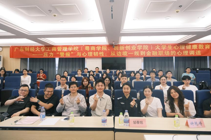 为更好落实立德树人根本任务,加强研究生心理健康教育,提升学生压力应对与心理韧性水平,3月31日下午,工商管理学院(粤商学院、创新创业学院)在尚学楼307阶梯教室成功举办“压力警报与心理韧性——从边境一线到金融职场的心理调适”专题讲座。讲座特邀中国人民警察大学基础部管理政工教研室主任、副教授邹春旭担任主讲,学院党委书记王德斌、辅导员钟艳婷以及研究生80余人参加了讲座。