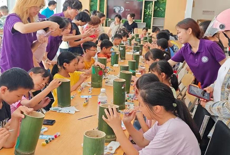孩子们兴致盎然,纷纷发挥想象力,在古朴的竹筒上勾勒图案、涂抹色彩。有的绘制了活泼可爱的卡通形象,有的描绘了生机勃勃的自然风景,还有的创作了充满民族特色的传统纹样。现场氛围热烈而温馨,孩子们在画笔的舞动中尽情释放创意,志愿者们则在旁及时给予鼓励与帮助,见证着每一件独特作品的诞生。